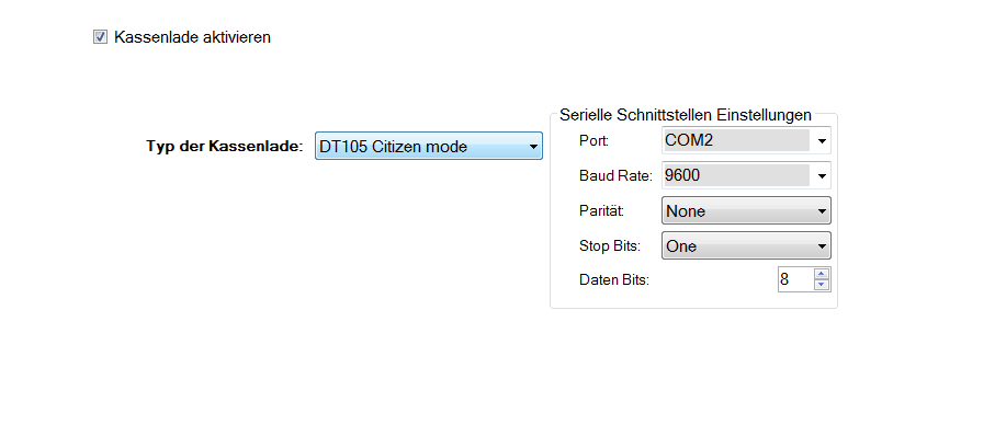Zugewiesenes COM-Port nachschlagen und in Terminalkonfiguration/Kassenlade folgende Einstellungen vornehmen: